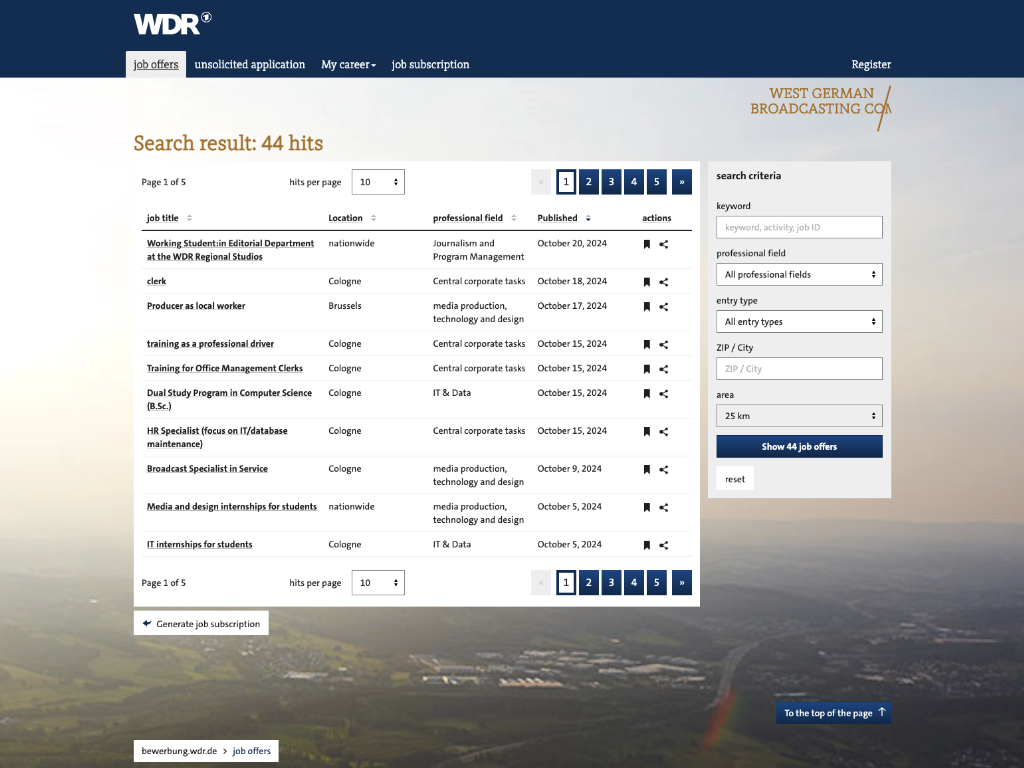 With over 4,000 employees, Westdeutscher Rundfunk (WDR) in Cologne is ARD’s largest broadcasting organization and the broadcaster with the second largest workforce in Europe after the BBC. Apprenticeships, internships and trainee programs are in particularly high demand, with several thousand applicants vying for around 120 junior positions every year.